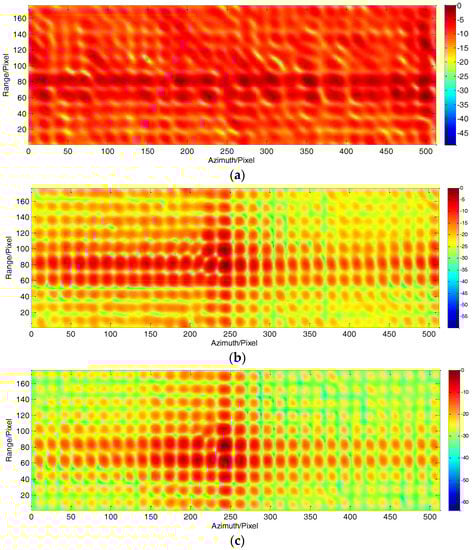 To show the advantages of the proposed approach, the profile of a dominant target in range compressed and azimuth time domain is displayed in Figure 4 at a size of 220 × 500 pixels. To clearly show the target trajectory, 100 times down-sampling has been done in azimuth. It can be seen that the trajectory without RDM approach shown in Figure 4a is severely curved, due to the unwanted LOS displacements. Furthermore, the curved trajectory is still clearly seen after using stripmap RDM approach. By using the sliding spotlight RDM approach, as shown in Figure 4c, the curved trajectory of the target is nearly corrected. However, a little curve remains. Finally, after integrating WTLS technique in sliding spotlight RDM approach, the curved trajectory is corrected to be a straight line, which is shown in Figure 4d indicating the effectiveness of the proposed approach.
