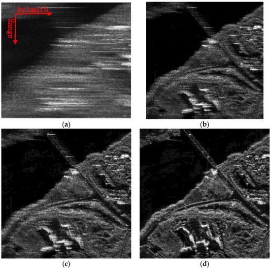 The local scenes at a size of 500 × 500 pixels, marked with red squares in Figure 3, are zoomed into and compared with other methods, which are shown in Figure 5. Both the images processed without MOCO and with only second-order MOCO are severely defocused. The processing result by combining the stripmap RDM approach and range-varying PGA is shown in Figure 5c, which has a much higher quality than Figure 5a,b. However, the resulting image is still blurred and needs to be improved. Although the quality of image shown in Figure 5d is improved by combining the sliding spotlight RDM approach and range-varying PGA, the defocusing phenomena still exists, especially in the left side of the image, where the flight is bumpy and the trajectory deviations are larger. Finally, the image is well focused in Figure 5e, where the roof of the buildings can be clearly distinguished. Meanwhile, the low backscattered areas have higher contrast in Figure 5e, clearly showing the advantages of the proposed algorithm. In addition, image contrast (IC) value and image entropy (IE) value, which generally represent good indicators of the general image focusing, are used to gauge the success of the proposed approaches [15,16]. As reported in Table 2, the image presented in Figure 5e shows the largest IC and the smallest IE value, which is in accordance to our image visual analysis.