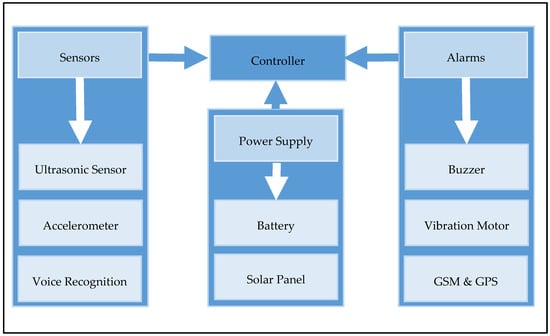 - Nalavade, K.C.; Bharmal, F.; Deore, T.; Patil, A. Use of ultrasonic sensors, GPS and GSM technology to implement alert and tracking system for blind man. In Proceedings of the International Conference of Advance Research and Innovation (ICARI), New Delhi, India, 1 February 2014; pp. 272–274. [Google Scholar]