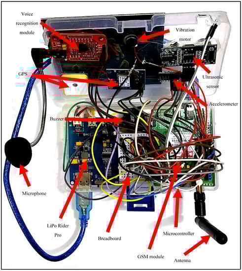 The system is endowed with three types of sensors, namely, ultrasonic sensor, accelerometer, and voice recognition sensor. We used an HC-SR04 ultrasonic sensor (Multicomp, Chicago, IL, USA; Datasheet) to detect objects in front of the user. The sensor has a range between 2 cm and 4 m of contactless measurement and includes a control unit and ultrasonic transmitter and receiver.