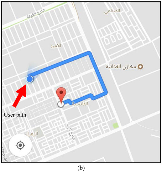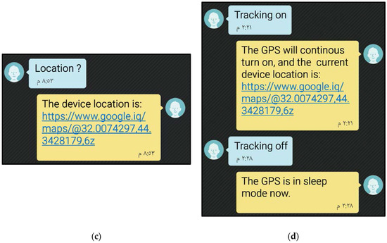 We implemented the proposed system as shown in Figure 3 and tested its functionality with users wearing it, as shown in Figure 4. The alarm SMSs transmitted from the system to the family and caregivers’ mobile phones are shown in Figure 5a,b, for the stumbling alarm and the assistance request, respectively. The SMSs with the system location and tracking status requested by family and caregivers are shown in Figure 5c,d, respectively. Finally, the system location in Google Maps and the system tracking are shown in Figure 6a,b, respectively.