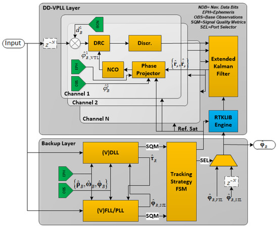 Figure 1 shows the overall structure of the proposed tracking loop architecture. The input signal passes through two different layers. The backup layer is a high-sensitivity tracking loop, responsible for maximizing measurement availability as well as providing reference satellite measurements. It can be a STL, VTL or any other algorithm through which signal parameters can be estimated.