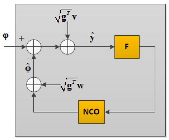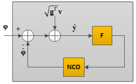 for the ith channel. A simplified model for VTL is shown in Figure 2 in which a linearized discriminator takes the difference between the incoming carrier phase vector () and the estimated vector (), generated by a numerically controlled oscillator (NCO). The measurements are contaminated by the additive noise vector () and are passed through loop filters (F).