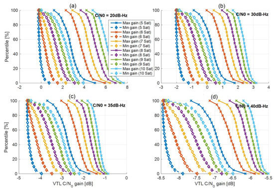 In contrast to VTL, the gain can be negative, leading to a worse performance compared to STL. According to Equation (24), when the rover C/N0 values are 20 dB-Hz, the ratio . Hence, the DD-VPLL gain is almost equal to the VTL case (i.e., ) and is always positive (upper left subplot). Since the base station observation noise is very small in this case, the VTL gain is much larger than the loss due to the noise amplification effect of the differential operation. As the rover C/N0 increases, the ratio increases and the gain decreases (upper right and lower left subplots) due to the adverse effects of double differencing. The worst case is when the rover C/N0 values are equal to or greater than those of the base station (lower right subplot). In this case, the gain is always negative due to the limited VTL gain compared to the differencing operation degradation.