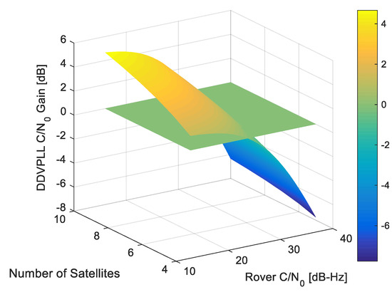 Figure 5 shows the average C/N0 gain of DD-VPLL as the number of satellites and rover channels C/N0 values change. The 0 dB threshold is shown, to visualize the cases when DD-VPLL outperforms STL. For low C/N0 values, DD-VPLL has a far better performance.