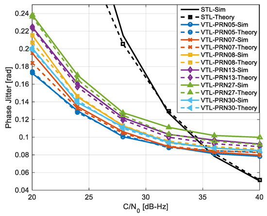 This section evaluates the performance of DD-VPLL compared to STL. Herein, the worst case scenario used is defined as that when all satellite signals, including the reference, are attenuated at the same time and by the same amount. Figure 6 shows the carrier phase jitter for different C/N0 values. Unlike STL, the performance of different channels is not equal in the vector tracking due to its dependency on satellite geometry. For high C/N0 values, the tracking jitter values in DD-VPLL are slightly worse than their corresponding values in the STL. However, as the C/N0 decreases to 35 dB-Hz or less, the proposed method outperforms STL as the information from all satellites is used to estimate signal parameters in each channel. This simulation also verifies the theoretical analysis which resulted in Equation (24).