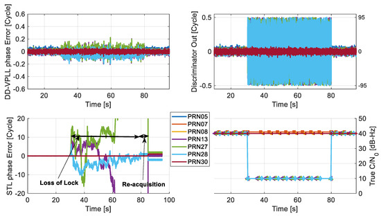 Figure 7 compares the tracking phase errors of DD-VPLL and STL for all satellites. Obviously, the proposed method can track attenuated PRNs properly (with tracking errors of up to 0.2 cycles) whereas the STLs fail to follow the incoming signals and experience loss of lock during the blockage interval. Also, STL requires extra re-acquisition time for recovery, with the help of the acquisition block to obtain an initial rough estimation of the signals after the attenuation interval.