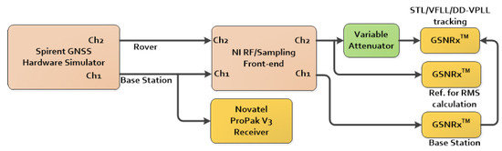 One of the two available channels in the hardware simulator is used for base station observations. Hence, only one channel is available for the rover station. Also, true rover carrier phases are required for carrier phase error analysis. Hence, the rover signals are not attenuated before the receivers and a standard version of GSNRxTM is utilized to generate true carrier phase values.