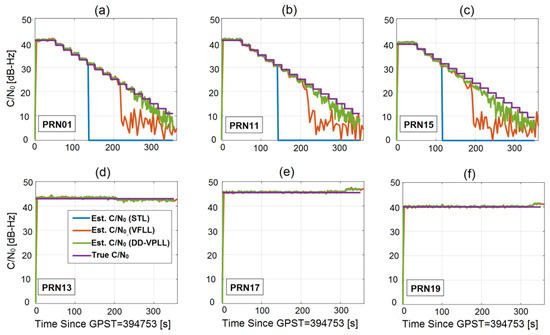 Actual and estimated C/N0 values for all satellites, different types of tracking loops and a circular motion rover when PRNs 01, 11 and 15 are attenuated with a staircase function over time (a–c) and the others have constant C/N0 values (d–f).