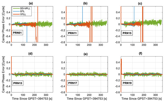 As shown in Figure 10, while DD-VPLL provides continuous carrier tracking, STL loses lock around 120 s and VFLL goes out of lock at 180 s for PRN 15 (the worst case). Furthermore, the estimated C/N0 values (i.e., Figure 9) for DD-VPLL are closer to the true values, mainly due to robust signal tracking and small tracking phase error compared to the other tracking algorithms. Nevertheless, the main drawback of the proposed tracking loop is when the signals are strong (e.g., interval 0–100 s) in which DD-VPLL has larger carrier phase errors as the differencing operation magnifies the uncorrelated noise component of the observations.