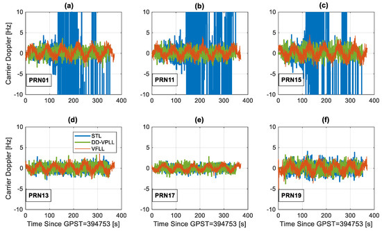 The estimated carrier Doppler errors for different satellites are shown in Figure 11. These measurements are available for a larger interval (up to 350 s for attenuated PRNs) as frequency tracking is usually less stringent than that of phase tracking. Thus, the receiver switches to the frequency lock loop (FLL) when a reliable carrier phase cannot be estimated.