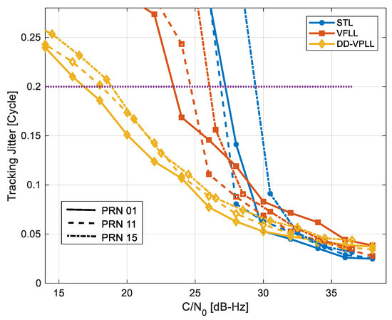 Figure 12 shows the discriminator output tracking jitter values versus C/N0 values for different tracking algorithms. There are slight discrepancies among various satellites’ performances as the dynamic stress in the tracking loop of each channel depends on its corresponding satellite to the rover directional vector. Tracking sensitivity is defined as the minimum C/N0 value for which tracking jitter is below a predefined threshold. Herein, a threshold of 0.2 cycles (1/5 of the discriminator linear range) is considered for sensitivity analysis.