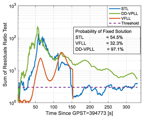 Comparing the RTKLIB sum of residual ratio tests for different methods in Figure 13 indicates that when utilizing the proposed tracking loop, the probability of a fixed solution increases significantly. A larger ratio means that the ambiguity resolution algorithm has higher confidence in the selected integer ambiguity set [20]. When the ratio test surpasses a constant threshold, the ambiguities are used for fixed integer solution estimation. The probability of a fixed solution is defined as the time percentage that a fixed solution is available.