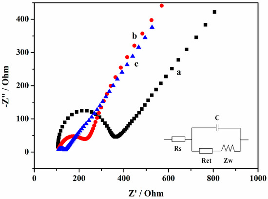 Electrochemical impedance spectroscopy (EIS) measurements of different modified glassy carbon electrodes (GCEs) in 0.10 mol·L−1 KCl aqueous solution containing 10 mM [Fe(CN)6]3−/4−: (a) bare GCE; (b) Gr/GCE; (c) AuNPs/Gr/GCE. The inset is the equivalent electric circuit of impedance.