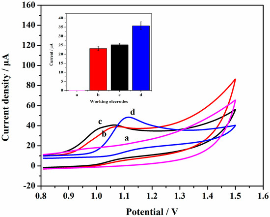 Cyclic voltammetry (CV) curves of (a) bare GCE without Sulfanilamide (SAM); (b) bare GCE; (c) Gr/GCE; and (d) AuNPs/Gr/GCE in 1.0 × 10−3 mol·L−1 SAM (pH = 2.0) .The inset is the quantification of peaks appearing on the voltammogram. The potential sweep rate was 100 mV·s−1.
