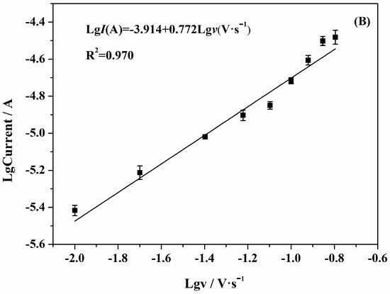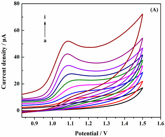 (A) CVs of AuNPs/Gr/GCE at different scan rates: (a) 10; (b) 20; (c) 40; (d) 60; (e) 80; (f) 100; (g) 120; (h) 140; (i) 160 mV·s−1; (B) Relationship of the logarithm of oxidation peak current versus the logarithm of scan rates.