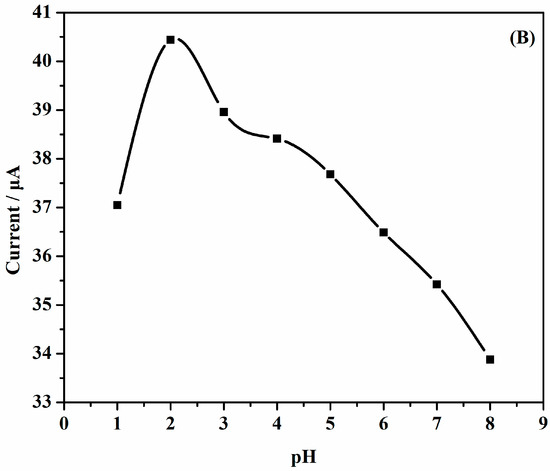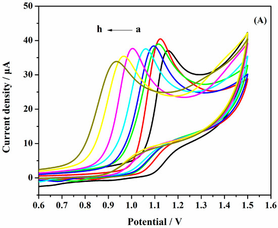 (A) CVs of a solution of 1.0 × 10−3 mol·L−1 SAM AuNPs/Gr/GCE at various buffered pHs: (a) 1.0; (b) 2.0; (c) 3.0; (d) 4.0; (e) 5.0; (f) 6.0; (g) 7.0; (h) 8.0; (B) Effects of pH and the oxidation peak current of 1.0 × 10−3 mol·L−1 SAM.