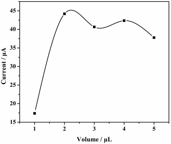 As can be seen from Figure 8, when the modification volume was 2 μL, the oxidation peak current was the highest and the electrochemical response was the strongest. Therefore, 2 μL was chosen as the best volume of modification.