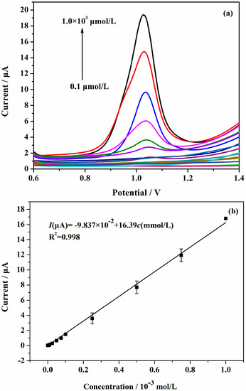 (a) Differential pulse voltammetry (DPV) measurements of different concentrations of SAM in 0.04 mol·L−1 Britton-Robinson (BR) buffer solution (pH 2.0) using 2 μL AuNPs/Gr/GCE; (b) The plots of linear relationship between SAM concentration and oxidation peak current: 0.1 to 1000 μmol·L−1. The potential sweep rate was 100 mV·s−1. (Amplitude: 0. 05 V, pulse width: 0.2 s, sampling width: 0.0167 s, pulse period: 0.5 s).