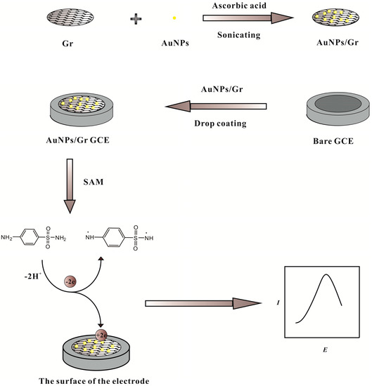 In this work, a simple, feasible, and convenient electrochemical sensor for detecting sulfanilamide based on AuNP-functionalized Gr was constructed. Gr provided a large platform and the introduction of AuNPs raised its stability and maintained its inherent performances, for example, its large surface area and excellent conductivity. The AuNPs/Gr promoted electron transfer in the electropolymerization oxidation of sulfanilamide as electron transfer mediators when analytes were enriched on the surface of the electrode (Scheme 1). According to the changes of the differential pulse voltammetry response current, the detection of sulfanilamide could be achieved.