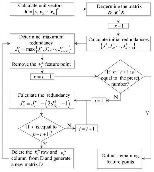 Then, new redundancies and the largest redundancy are recalculated for the new matrix using Equation (21). Remove the -th feature point, and delete the -th row and column from the new . Another new matrix with dimensions is generated.