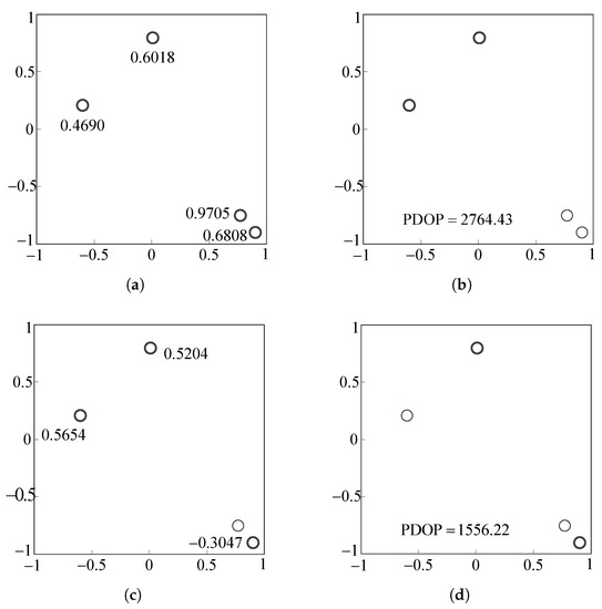 Figure 5c is the first step of the iterative method. It removes the feature point and recalculates the new redundancies of the remaining three feature points. Then, the feature point is removed because it has the largest redundancy in new redundancies as shown Figure 5d. The two feature points and are left. Their PDOP is , which is only higher than the optimal PDOP value.