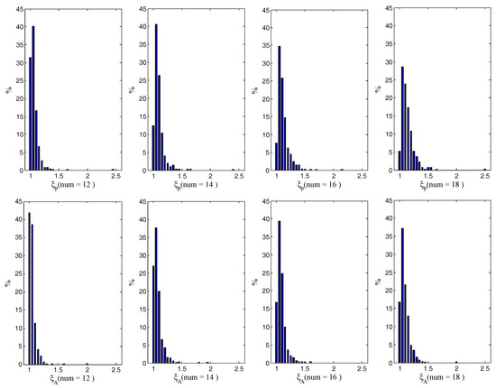 The simulations assume that there are four groups of feature points with different numbers (12, 14, 16 and 18), but only eight feature points are selected. In each group, feature points for 1000 cases are randomly generated. The two selection methods are implemented and tested with these feature points. For each case, the PDOP and ADOP values of the feature points selected by the quasi-optimal method are calculated. The smallest PDOP and ADOP values are selected from all possible PDOP and ADOP values. Then, the DOP ratios, and , are determined and evaluated.
