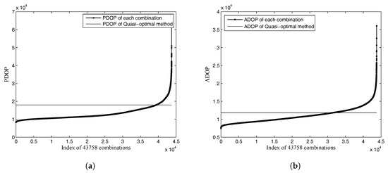 All possible DOP values and DOP values of the quasi-optimal method with and . (a) PDOP values; (b) attitude DOP (ADOP) values.
