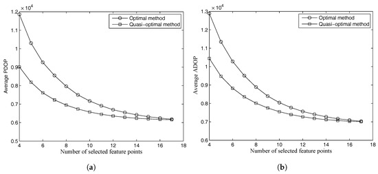 The average and maximum DOP ratios for different numbers are shown in Table 4. In the group of 18 feature points, the average and are and , respectively. Thus, the average PDOP value of the quasi-optimal method is 13.24% greater than the optimal PDOP value, and the average ADOP value of the quasi-optimal method is only 8.97% greater than the optimal ADOP value on average in this group. This indicates that the average PDOP and ADOP values of the selected feature points are close to the average optimal values. Moreover, the other groups perform better than this group on average values.