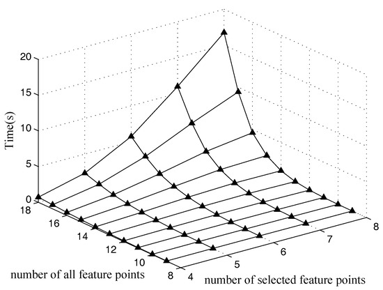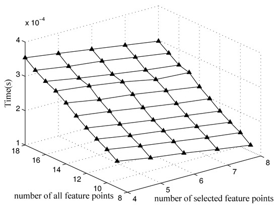 The average computation time of the optimal method and that of the quasi-optimal method are estimated in this section. The two methods are used to select 4–8 feature points out of 9–18 feature points for 1000 cases. Figure 9 shows the average time of the optimal method. The average time of the optimal method increases along with the increasing of the number of the total feature points. The reason is that more feature points provide more possible combinations. Figure 10 is the average time of the quasi-optimal method proposed in this paper. It shows that the time of the quasi-optimal method increases as the number of feature points increases. Notice that the time of the quasi-optimal is four orders of magnitude lower than that of the optimal method. This means that the quasi-optimal method outperforms the optimal method greatly in terms of computation time.