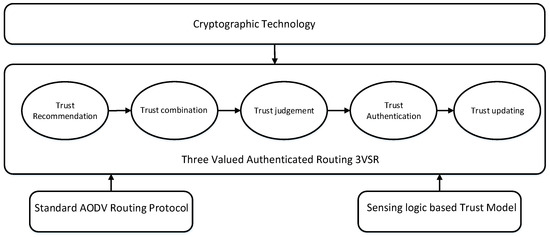 Frame work for the proposed scheme, the standard AODV is applied at second stage with enabling sensing logic-based trust model, while cryptographic technology is considered to take effect before this operation.