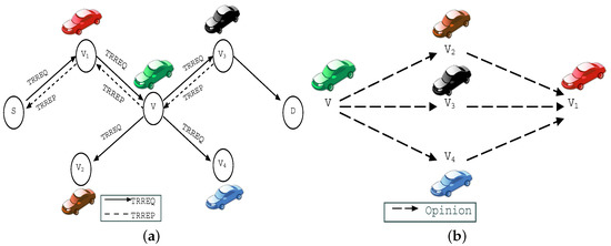 Discounting combination: Let , , and be three vehicles. Then, we can present algebraically as and shows opinions of about trustworthiness and about truthfulness of vehicle . Their discounting opinion is defined as , shows opinion on vehicle as advised by vehicle .