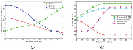 (a) Simulated analysis of belief, disbelief and uncertainty at network start. (b) Simulated behavior of trusted, malicious and new comers After some interaction.