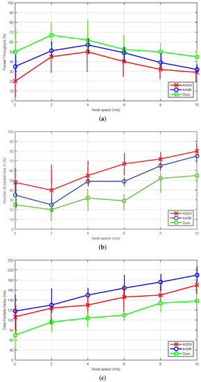 To simulate the adversarial effect, we have considered half of the nodes malicious i.e., 25 nodes having speed from 0 to 10 m/s in an arbitrary fashion. From Figure 8, we can see that 3VSR is better in throughput and packet loss ratio as compared with other routing protocols i.e., AODV and AASR. The performance of these protocols may be degraded under different mobility scenario. Despite the performance variation, our proposed scheme always achieves better throughput and lower packet loss as can be seen in Figure 8a,b, because it reduce computational overhead by avoiding complex cryptographic techniques. Meanwhile, AODV has lower delay values then AASR because if AASR is attacked by adversary it requires more cryptographic processing, which increases the delay. As a result, sometimes AASR performs worse than AODV, e.g., in the “slow” movement scenarios. The curves of the end-to-end delay are shown in Figure 8c, thus 3VSR is a better choice to adopt.