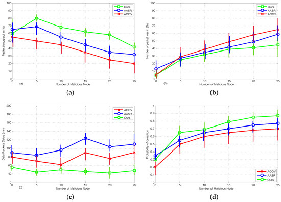 Performance comparison under different attack pattern: (a) Packet throughput. (b) Packet loss ratio. (c) End-to-end delay. (d) Probability of detection in between benevolent and malicious nodes.