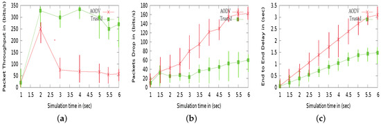 Comparison results between the original AODV and the trusted AODV under Black Hole attacks with parameters R = 250 m, V = 5 m/s, and N = 20: (a) packet Throughput. (b) Packet Drop in (%). (c) End-to-end delay.