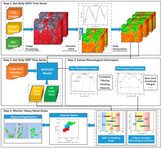 We used a comprehensive method to preprocess the remote sensing images to obtain smooth and complete daily NDVI time-series curves including image integration, NDVI calculation, denoising and daily interpolation. Then, the phenological information was extracted from the phenological cycle. The RS-WOFOST framework was applied given the difficulty in obtaining WRT data, LAI was a state variable that was acquired from both remote sensing images and the WOFOST model. A phenological indicator that was relatively sensitive to heavy metal stress in rice was chosen. Finally, a two-dimensional feature space was established based on the sensitive phenological indicator and WRT for heavy metal stress in rice. The work flow of this study is shown in Figure 2.
