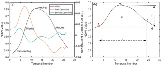 (a) The extraction of four key phenological stages (transplanting, tillering, heading and maturity stage) based on the first and second derivative of NDVI curve. (b) Application of dynamic threshold method to obtain other phenological parameters of rice. a–g represent the start of the season, the end of the season, length of the season, base level, largest value, seasonal amplitude, and seasonal integral, respectively.