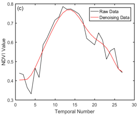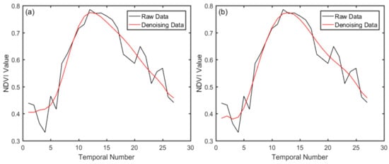 Due to the cloud and shadow, the time-series NDVI data still had considerable noise, so that it has to be reconstructed before application [42,43,44,45]. All current methods that can be used for reconstructing do not form a unified view, which means that no method is generally applicable [42,46,47]; and problems may occur when the Gaussian filters are applied to the VI time series of irregular dilemma in CCD images [28]. In this study, we applied statistical analysis to quantitatively evaluate some commonly used denoising methods, such as Savitzky-Golay (S-G) filter, Double Logistic Fitting, and Wavelet Filter, and chose a suitable method to eliminate noise. The S-G filter is a weighted average algorithm based on a sliding window that calculates the smooth value of a fixed number of points near a certain point by the n order fitted polynomial. In the S-G filter, setting the polynomial degree and window size is vital; we obtained the best smoothing results through constant repetitions [28]. Double logistic functions are fit to data in intervals around the maxima and minima in the time series, and the local fitting function is combined to form the whole fitting function to enhance the flexibility of the fitting function and conform the fitting function to the complex behavior of the NDVI time series data [48,49]. In wavelet transform, the denoising of the time series is realized by the wavelet inverse transformation of the low frequency part and quantization of the high frequency part [50].