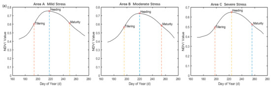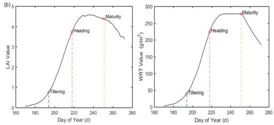 Figure 6b presents the time series of rice WRT and LAI in area A. We compared WRT and LAI curves with the daily NDVI time series. The rice grows rapidly during the tillering period, and the three curves all have considerable slope during this period. The time point corresponding to the maximum NDVI value is the heading stage. The rice enters the reproductive stage after spike differentiation, and the growth of the last leaf is completed before the end of heading stage; therefore, LAI reaches a maximum value. The rice begins to fill before the maturity stage, and first reaches the milk stage. The starch in the grains accumulates constantly and the dry and fresh weight increases, which corresponds to the section with a slight increase in the WRT curve when entering the heading period. When the rice reaches the maturity stage, the chlorophyll content decreases rapidly, the leaves gradually age and yellow, and the WRT and LAI decrease due to the competition of grain filling on the assimilates, which corresponds to the rapid decline in the two curves. At this time, NDVI declines most rapidly. The phenological stage in the LAI and WRT growth curves, corrected by phenology, is consistent with that in the NDVI time series curves.