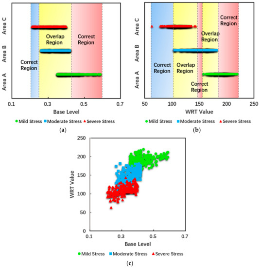 Given that the change in base level was larger than other phenological indicators in the three stress regions, the base level was selected as the most sensitive phenological indicator for this study. Although all phenological indicators were able to distinguish different heavy metal stress to a certain extent, some overlapping pixels still occurred on the divided intervals. So, we used the combination of WRT and phenology to establish a two-dimensional feature space, as taking full advantage of the two indicators can optimize stress monitoring ability. Figure 8a,b show the discrimination effect of different stress levels based on the analysis of 658 pixels for base level and WRT. The overlap area accounted for a large proportion of the total area, and had a certain effect with a single indicator for distinguishing stress level, but the accuracy was inadequate. For base level, the overlap of moderate and severe pollution areas was 70%, with mild and moderate overlapping by 50%. For WRT, the overlap of severe and moderate pollution areas was 60%, with mild and moderate overlapping by 50%. Therefore, the two-dimensional feature space was established by combining base level and WRT, as shown in Figure 8c.