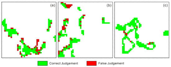 Figure 9 shows the application of the feature space on the regional scale. Among them, the green part is the area that belongs to the positive judgment; the red part is the area that belongs to misjudgment. Area A had 171 pixels for positive judgment, and 50 pixels misjudged, with a positive rate of 77.4%. Area B had 159 pixels for positive judgment, and 50 pixels misjudged, with positive rate of 76.1%. Area C had 217 pixels for positive judgment, and 11 pixels misjudged, with a positive rate of 95.2%. Therefore, the feature space that combined phenology and root weight relatively effectively estimated the heavy metal stress levels in rice in the study area.