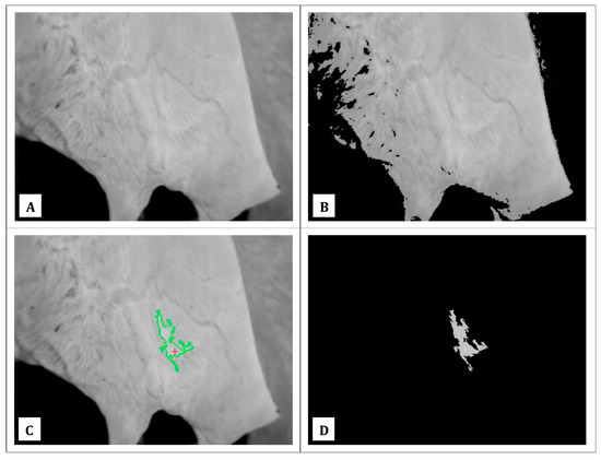 The figure shows some image elaborations performed by the algorithm of the developed software application. In details, in (A) is reported an example of a thermographic image acquired during the study carried out; In (B) is shown the result obtained applying as thresholds, a range of intensities calculated through the above reported formulas ([1,2]) and after identifying in thermographic image the pixel with the maximum intensity value (PImax). In the figure, almost the whole cow udder is highlighted. As a consequence, a grid, of dimensions 4 × 4 pixels can be applied in order to calculate the surface distribution of temperatures. In a following step, the maximum value of udder skin temperature (Tmax) can be identified as the maximum value within the surface temperatures calculated; In (C), it is shown with a red cross the location of the pixel PImax and with a green contour the APT calculated; In (D), finally, is reported the “temperatures proximity area” (APT) obtained considering the coordinates of PImax and a set of connected pixels which intensities are different from zero after applying the above reported filter [3].