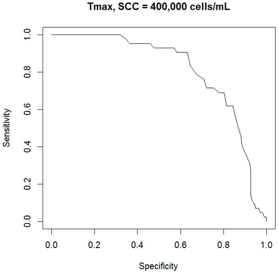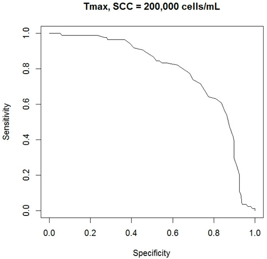 In a following phase of statistical analysis, the detection performances of the variable Tmax were investigated. Two different thresholds of SCC were used to classify the udders health status (i.e., 200,000 cells/mL and 400,000 cells/mL). For each SCC’ threshold, a ROC curve was calculated through the couples of sensitivity and specificity shown by the statistical test when different possible cutoff levels were selected. In Figure 2 and Figure 3, the ROC curves obtained are reported.