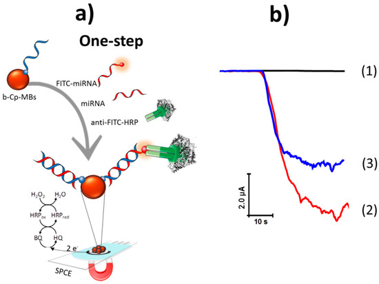 On the other hand, it has been widely demonstrated that magnetic microbeads (MBs) offer very attractive characteristics in the development of electrochemical biosensors, such as lower limits of detection, faster assay kinetics, and smaller matrix effects [22,23,24,25]. These advantages have been coupled in many cases with those provided by planar disposable electrodes (versatility of fabrication and mass production at low cost) to develop different competitive electrochemical biosensing platforms for the quantification of miRNAs. Nevertheless, most of these platforms involve different preparation steps and require the use of expensive affinity reagents [26,27,28,29,30,31] and multiple probes in connection with amplification strategies [28,32].