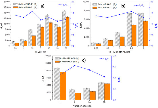 Dependence of the amperometric signals measured with the competitive DNA/RNA hybridization biosensor in the absence (S0) and in the presence of 5.0 nM miRNA-21 (S1), and the corresponding S0/S1 ratio with the b-Cp (a) and FITC-miRNA (b) loadings and with the number of steps involved in the biosensor preparation (c). Error bars estimated as three times the standard deviation of three replicates.