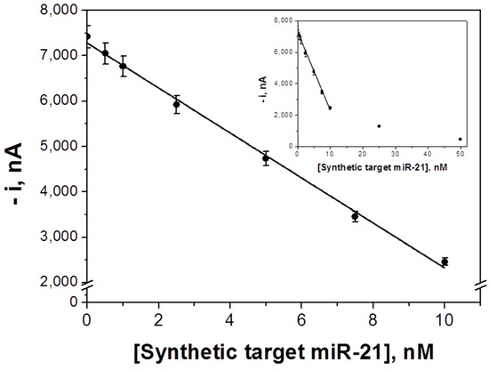 The calibration curve constructed for the amperometric determination of the synthetic target miRNA is displayed in Figure 3. As expected for a competitive hybridization assay, the larger the concentration of target miRNA the lower the amperometric response as a consequence of the lower concentration of FITC-miRNA and consequently of anti-FITC-HRP attached to the MBs. A linear dependence (r = 0.999) of the current values measured with the miRNA-21 concentration was found from 0.7 to 10.0 nM, with slope and intercept values of (−496 ± 12) nA nM−1 and (7279 ± 65) nA, respectively. The calculated LOD and LOQ values were 0.2 and 0.7 nM (5 and 17.5 fmol in 25 μL of sample), respectively.