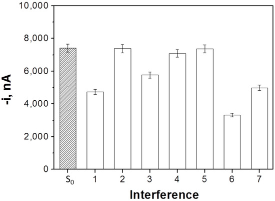 Selectivity of the developed competitive DNA/RNA hybridization-based biosensor for determination of miRNA-21. Amperometric responses measured in the absence (S0) and in the presence of 5.0 nM miRNA-21 (1), 1-m (c) (2), 1-m (t) (3), NC1 (miRNA-205) (4), NC2 (miRNA-122) (5), and mixture solutions containing the target miRNA and the two 1-m (6) or the target miRNA and the two non-complementary (NC) sequences (7). Error bars estimated as three times the standard deviation of three replicates.