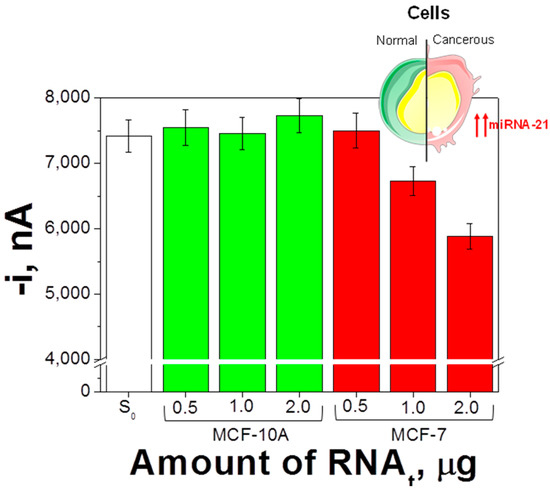 The amperometric signals provided by the biosensor in the analysis of different amounts of RNAt extracted from both types of cell are shown in Figure 5. As expected, substantially lower amperometric responses were measured for RNAt extracted from the MCF-7 when compared with those from MCF-10A cells according to the overexpression of the oncogenic target miRNA in the cancerous cells [7,26,27,32,41] as long as the amount of extracted RNAt from MCF-7 cells was at least 1 μg.