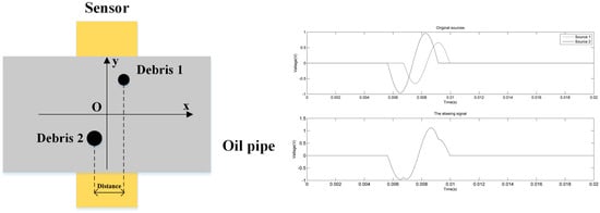 For speech separation, usually two or more microphones are arranged in the environment to collect the speech signals. The limitation of using one microphone is that an infinite number of solutions can be obtained from only one aliasing signal. By using two or more microphones, the same sound travels and arrives at different microphones with different delays and attenuations, resulting in different signals. The signals with different delays and attenuations are the observations of the sound from different perspectives in the time-frequency domain, which gives opportunities for the separation of the sounds. As for the abrasive debris detection, if the debris induces voltages with different delays or attenuations when going through different sensors, the aliasing signals can be separated into several estimated sources from the time-frequency domain. The time-frequency domain method for the debris detection signals separation is more suitable compared with the speech signals separation. The debris in the oil will only go through the sensors once, while the sound will be reflected by the walls and arrive at one microphone several times, forming the so-called echoic system. Besides, because of the viscosity of the oil, particles transfer in the oil with different velocities, which leads to different phase displacements of two particles at two different locations in the oil pipe. The inherent characteristics of the debris detection guarantee that most of the superimposed abrasive debris will show different delays and attenuations after moving for some distance.